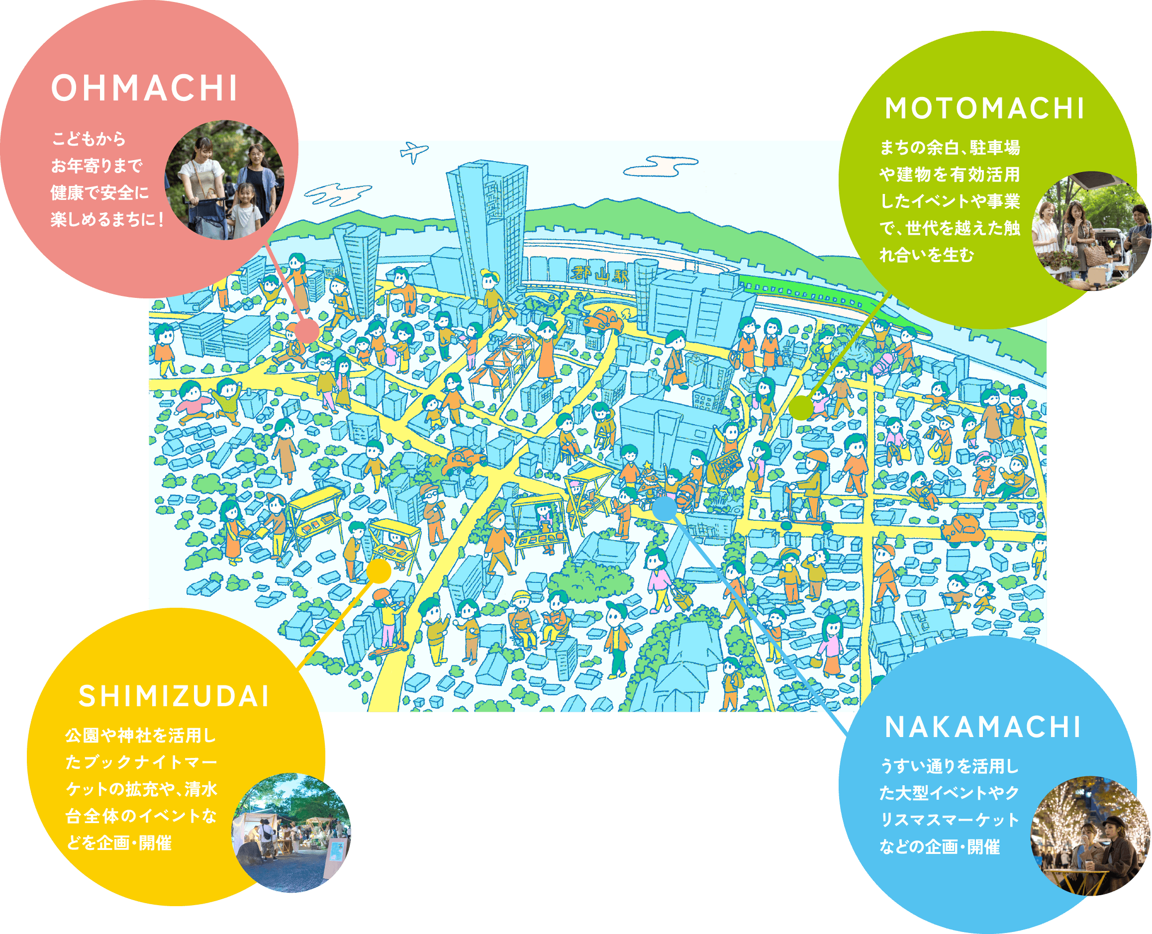 公園や神社を活用したブックナイトマーケットの拡充や、清水台全体のイベントなどを企画・開催